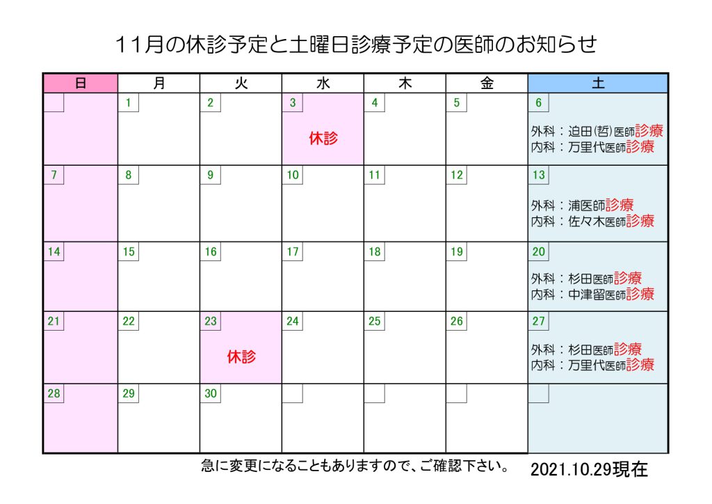 【迫田病院】土曜日診療予定・休診日に関するお知らせ(11月)