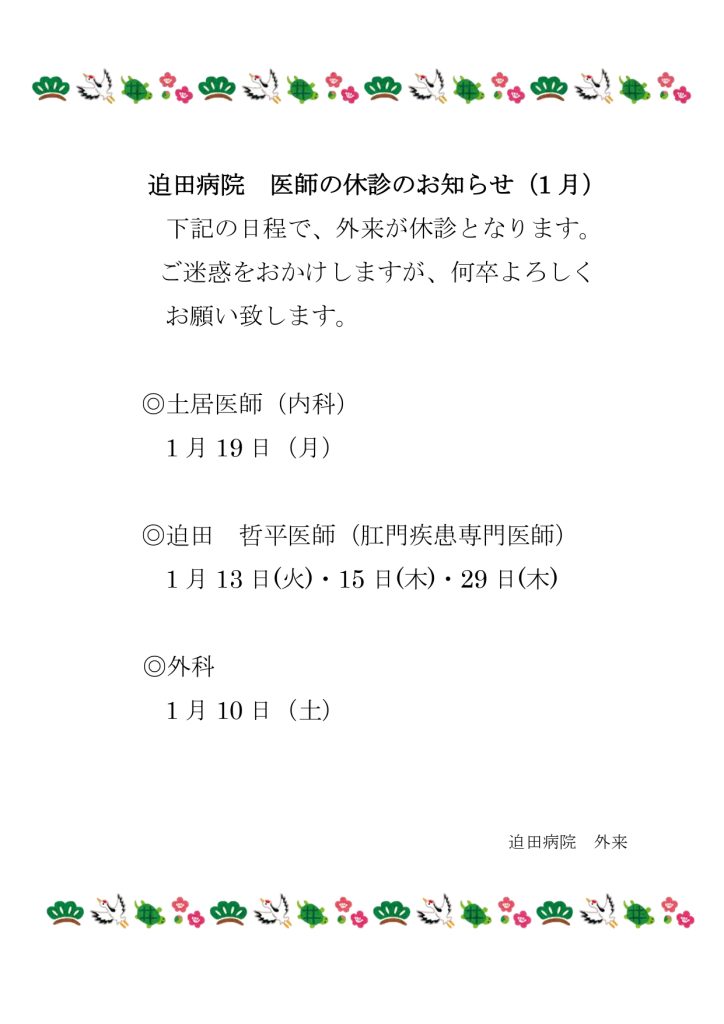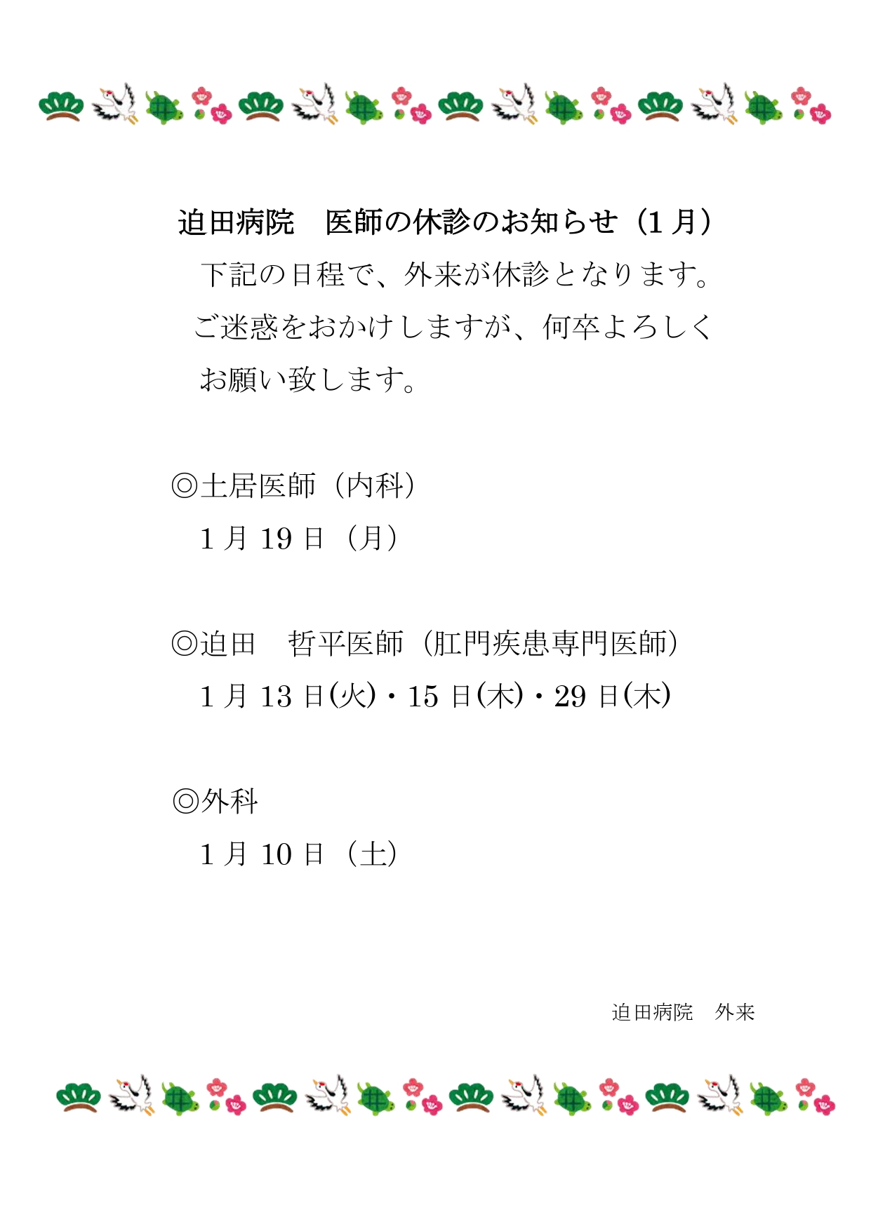 【迫田病院】1月10日(土)の外科外来休診のお知らせ