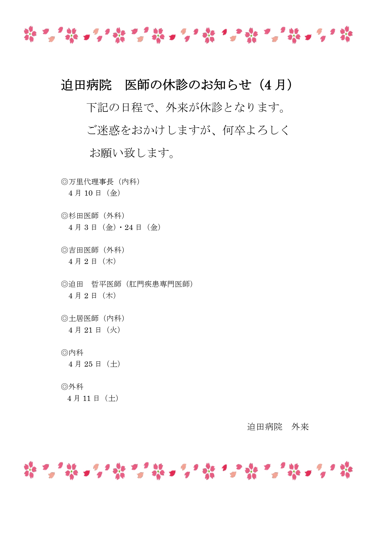 【迫田病院】3月28日(土)の内科外来休診のお知らせ